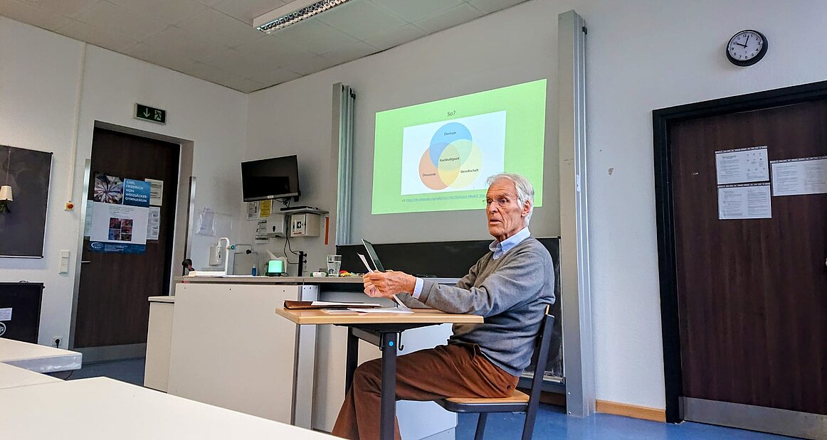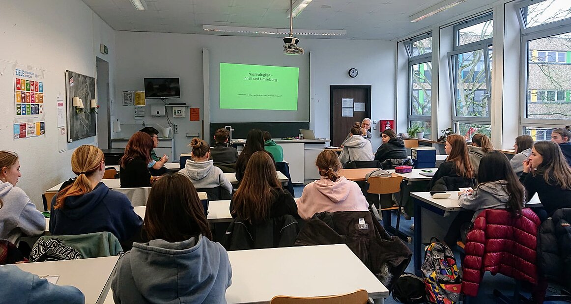 Nach gemeinsamer Terminfindung und inhaltlicher Abstimmung, für die der Forscher zuvor auch einen Blick auf das Lernboard des Kurses werfen konnte, war es dann am 30.01. in der 3. Und 4. Stunde soweit. Auch ein kurzfristiger Stromausfall konnte uns nicht daran hindern, dass wir uns durch den Vortrag und die Präsentation, die verständlichen Beispiele und Fragen „des Professors“ intensiv mit unserem Verständnis des Begriffes „Nachhaltigkeit“ auseinandersetzen. Und so erfuhren wir u.a., dass „Effizienz“, „Konsistenz“ (Kreislaufwirtschaft) und „Suffizienz“ im besten Falle kombiniert werden sollten, um ein zufriedenstellendes Leben für möglichst viele Menschen der jetzigen und zukünftigen Generationen zu erreichen. Ein kleiner Vorher- Nachher-Abgleich ergab daher auch für die allermeisten Schüler:innen ein erweitertes, präziseres Verständnis von „Nachhaltigkeit“ und auch das feedback für den Forschenden fiel gut aus. Seine Erfahrung und sein Wissen, sein Interesse am Thema und den Fragen der Schüler:innen, die er geduldig und verständlich beantwortete, wurde hier besonders gelobt. Wir konnten aus dem Zusammentreffen von „Wissenschaft“ und „Schule“, „Forscher“ und „Schüler:innen“ viel Input und Ideen für unserer weitere Arbeit rund um BNE (Bildung für nachhaltige Entwicklung) mitnehmen.