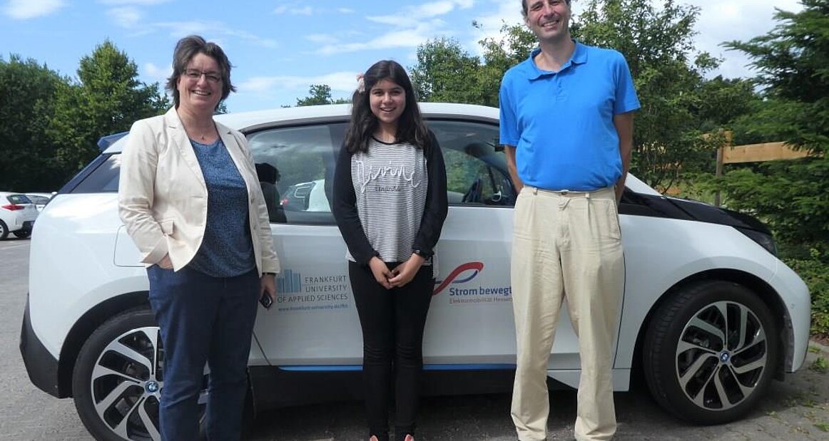 Frau Oetken, die Lehrerin von Asal fragte über die Forschungsbörse an, da ihre Schülerin viele Ideen zu Elektroautos hatte und es in der Schule dafür keinen passenden Ansprechpartner gab. Zusammen mit Kollegen Deegener aus dem Maschinenbau besuchte ich Asal auf ihrer Schule in Frankfurt mit dem Elektroauto. Dort hatten wir Zeit, ihre Ideen zu diskutieren und ihr Anregungen für ihre weitere Arbeit zu geben. Anbei der Bericht, den Asal für die Schule dazu geschrieben hat: