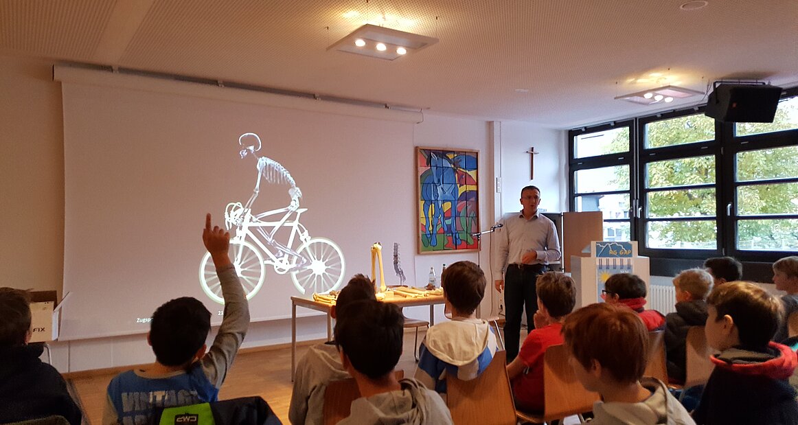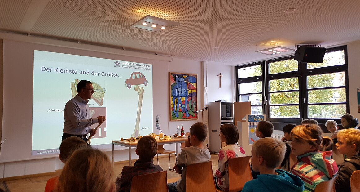 Am Freitag, den 22.10.2016, besuchte Herr Prof. Dr. Augat, Leiter des Institutes für Biomechanik der Unfallklinik Murnau, die Zugspitzrealschule. Die fünften Klassen erhielten an diesem Tag Informationen rund um das Thema „Warum braucht der Mensch Knochen?“. Die Schülerinnen und Schüler lernten etwas über den Knochenaufbau, die Funktion der Knochen, über verschiedene Knochenverletzungen sowie deren Behandlungsmöglichkeiten. Im Anschluss an die Veranstaltung konnten die Schülerinnen und Schüler den Experten mit ihren Fragen löchern und die mitgebrachten Anschauungsobjekte genauer betrachten. Die Fünftklässler folgten dem Vortrag aktiv und mit großem Interesse und waren durchwegs begeistert.